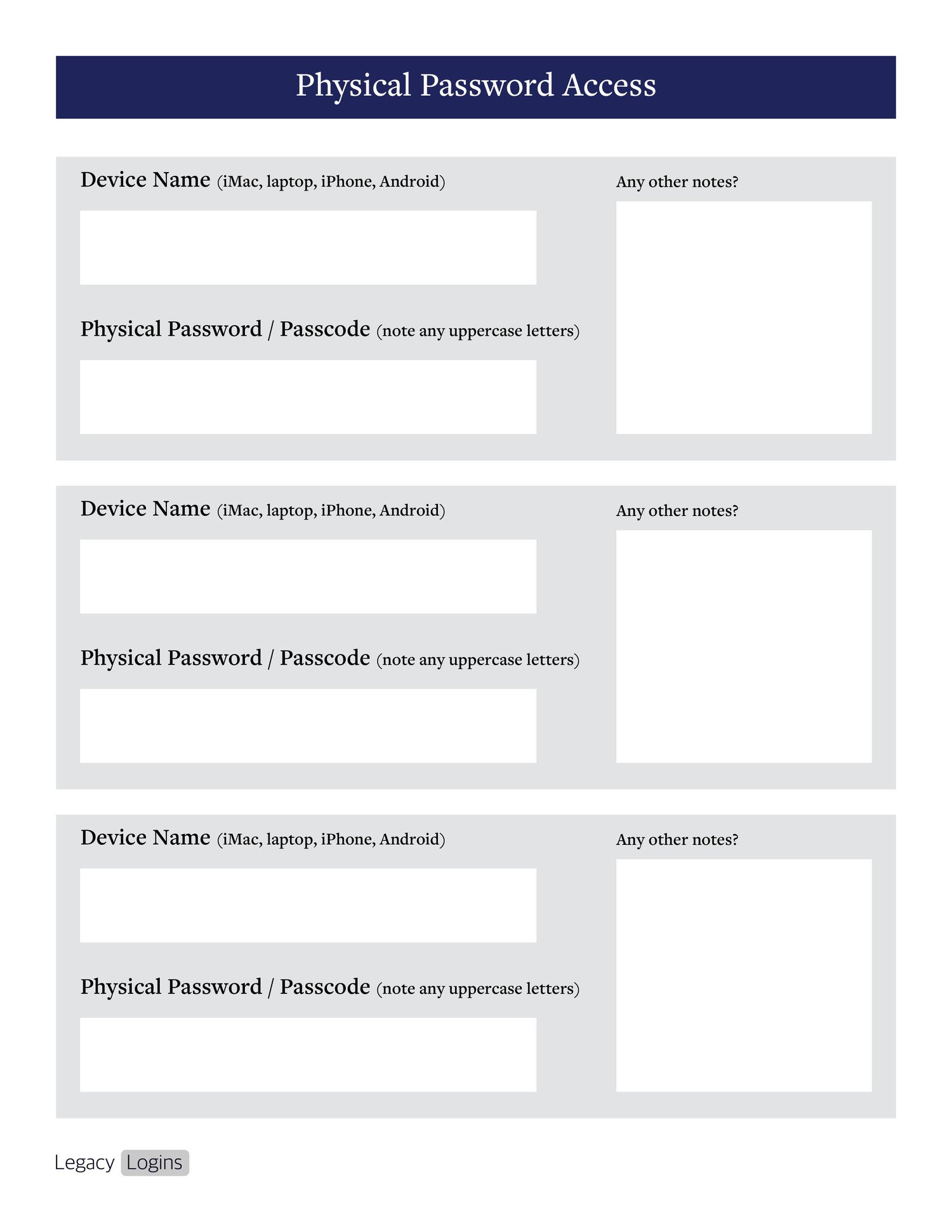 This editable PDF is a perfect spot for recording pertinent information about your loved one's social media and physical passwords. By having both of those, you'll be able to handle their social media through phone & computer access.