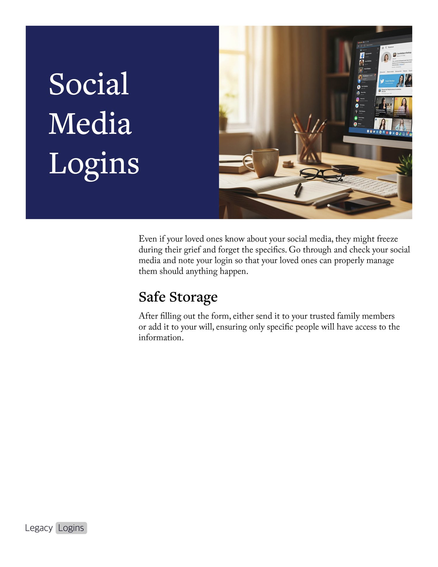 In addition to computer passwords, the Social Media Logins section is designed to log and record what social media accounts, the logins involved & what your loved ones should do with them. By providing computer and/or phone access, your loved ones will easily be able to access your social media and manage it easily and per your wishes.